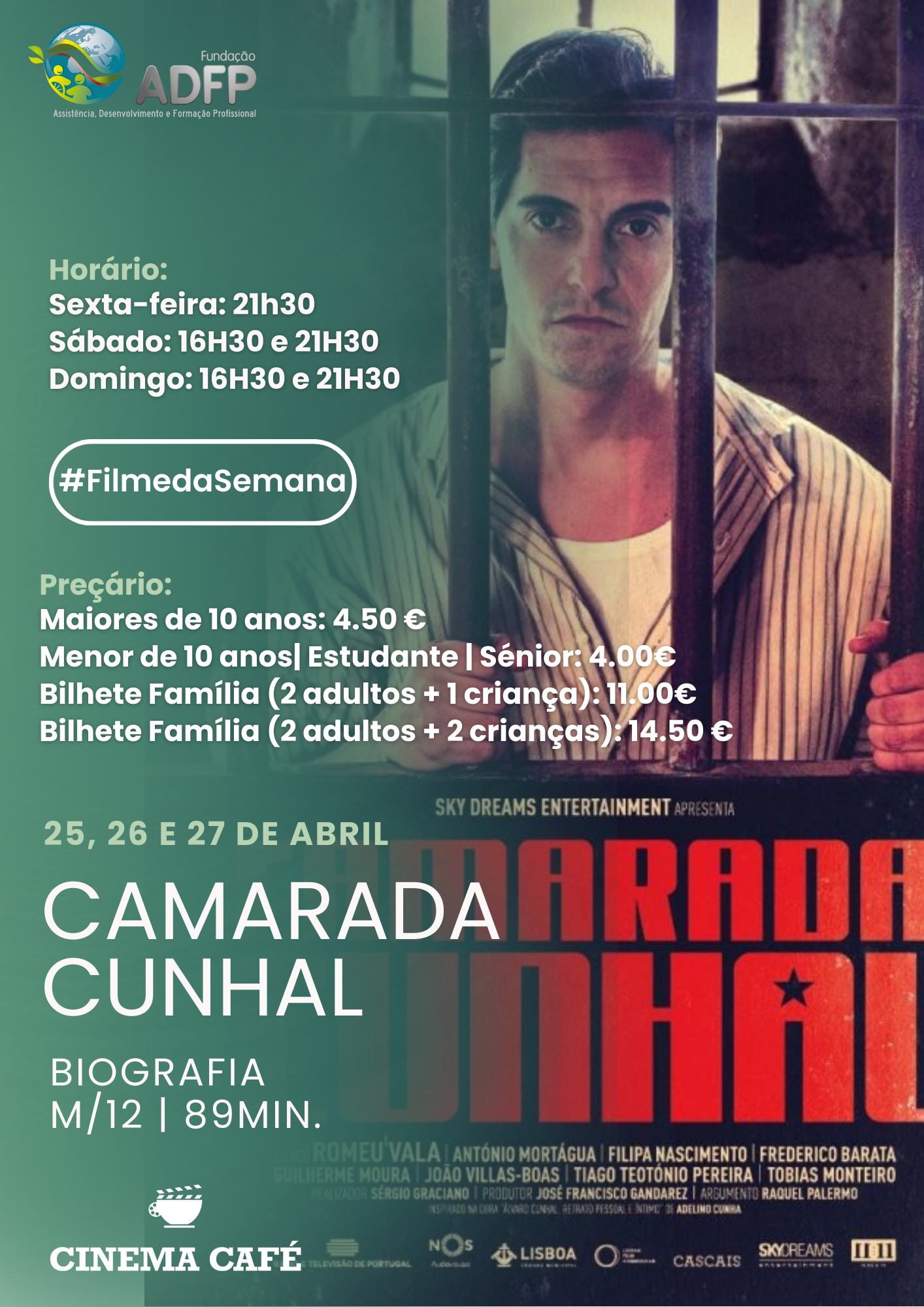 Sexta 21h30 | Sábado e Domingo 16h30 / 21h30 Menor de 10 anos | Estudante | Sénior: 4.00€ | 3D – 5.50 €; Maiores de 10 anos: 4.50 € | 3D – 6.00€; Bilhete Família | 2 adultos + 1 criança: 11.00€; Bilhete Família | 2 adultos + 2 criança: 14.50 €