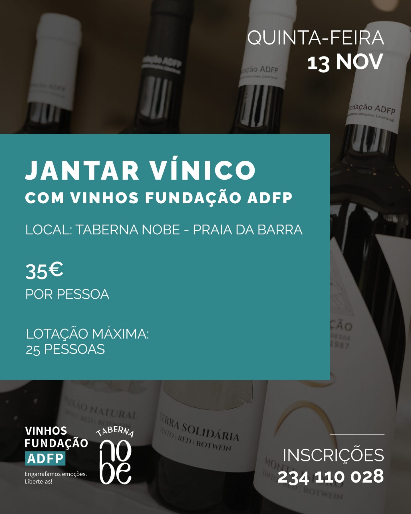 Temos o prazer de convidar-vos para mais uma edição de “Vinhos Fundação ADFP fora de portas”, um jantar vínico especial que levará os nossos vinhos até à Taberna Nobe, na Praia da Barra, em Aveiro, no dia 13 de novembro.