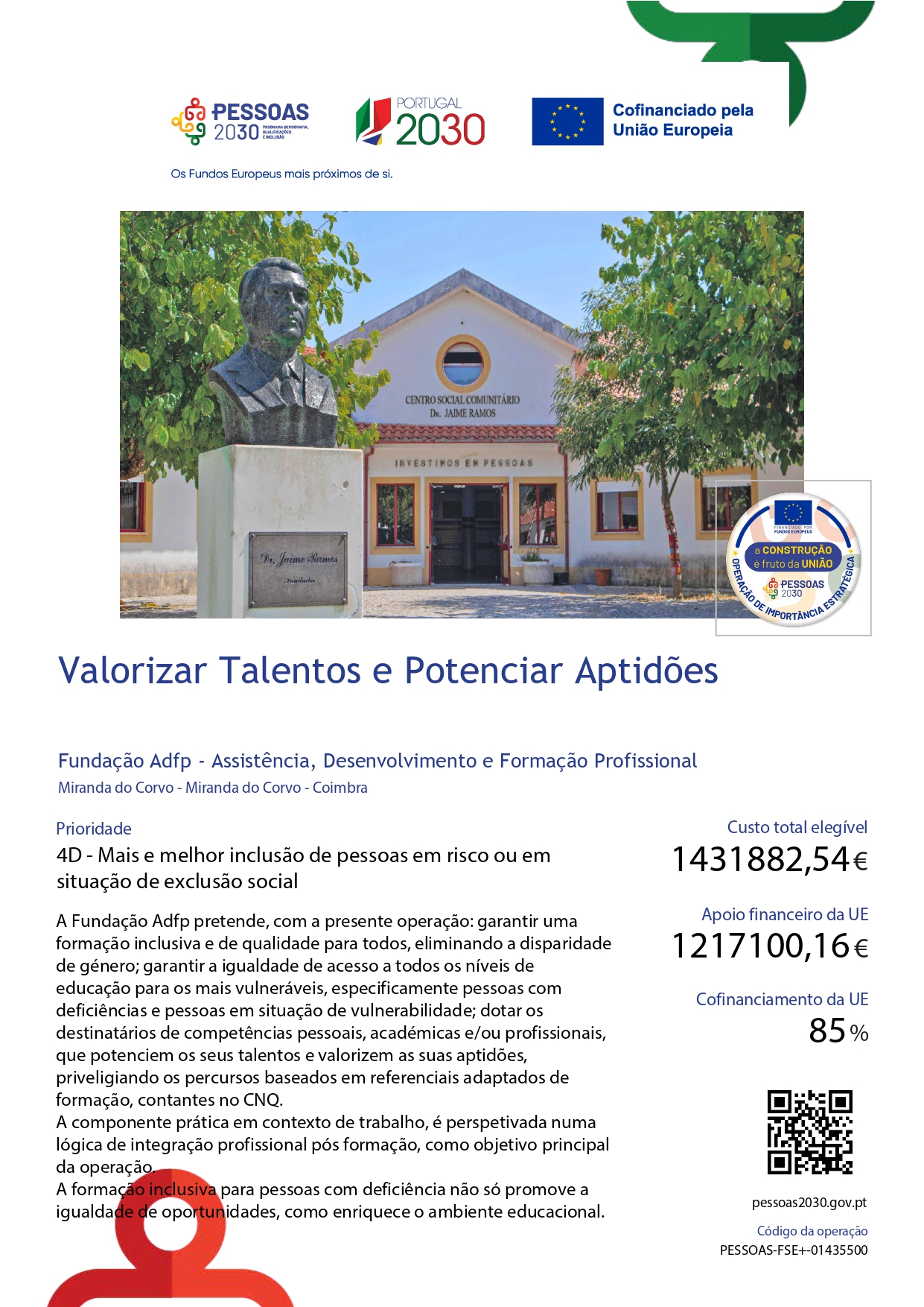 Seguindo essa mesma lógica, a Fundação ADFP vai continuar a apostar na Formação Profissional, nomeadamente em cursos de DUPLA CERTIFICAÇÃO, pretendendo sempre a melhoria na oferta formativa e adequação às exigências do mercado de trabalho.