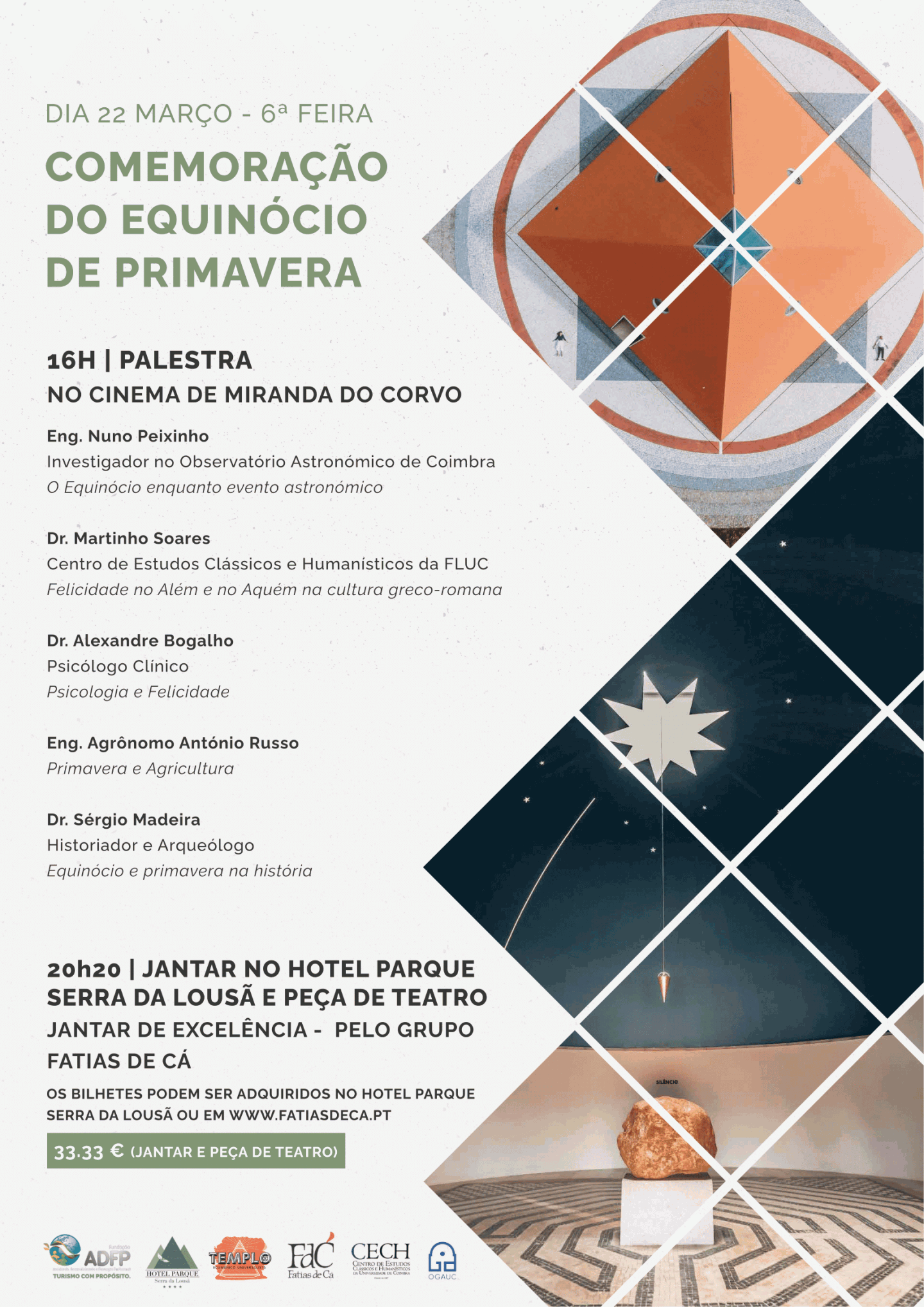 À semelhança de anos anteriores, desde a construção do Templo Ecuménico, e para comemorar a chegada desta época que é sinónimo de felicidade, mas que está associada a tantas outras áreas, a Fundação ADFP irá realizar uma palestra sobre este tema e evento astronómico, já esta 6ª feira, dia 22 de março, no Cinema de Miranda do Corvo. A entrada é livre, e não carece de inscrição prévia.