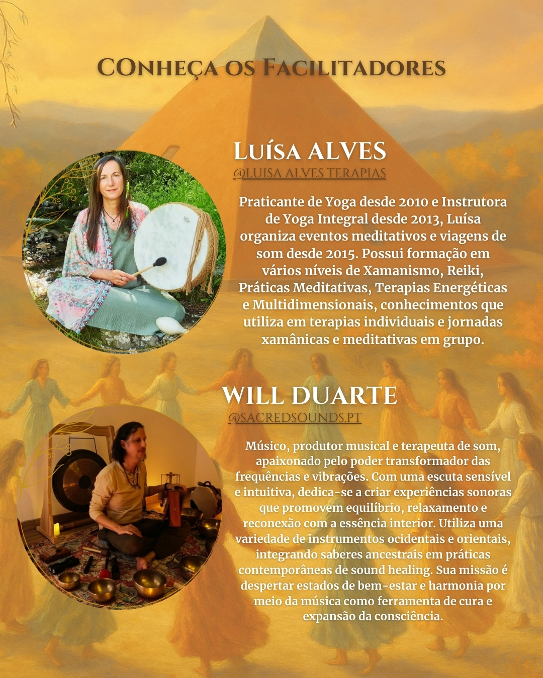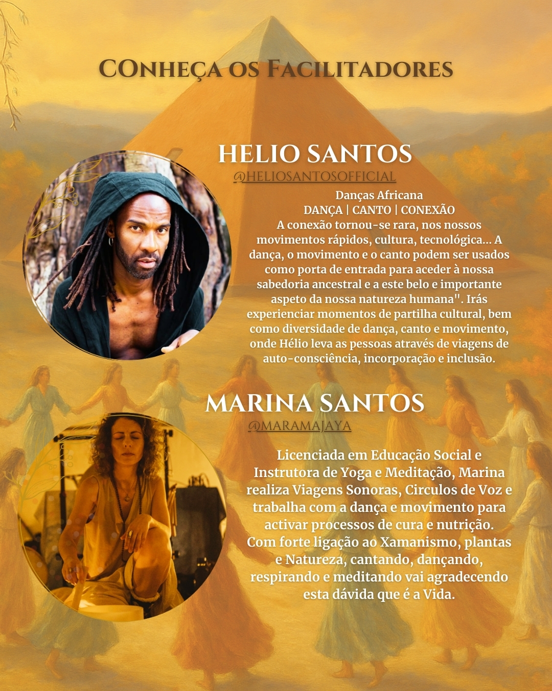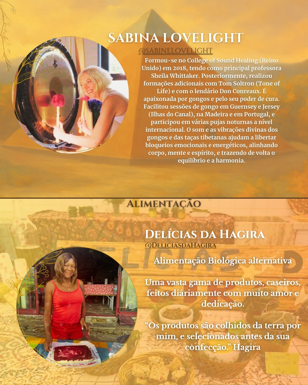 Participam nomes como Sabina Lovelight (gongs e taças tibetanas), Hélio Santos (danças africanas e canto), Marina Santos (yoga e viagens sonoras), Will Duarte (músico e terapeuta de som), e a organizadora Luísa Alves (yoga integral), acompanhados ainda pelo projeto “Delícias da Hagira, de alimentação biológica alternativa.