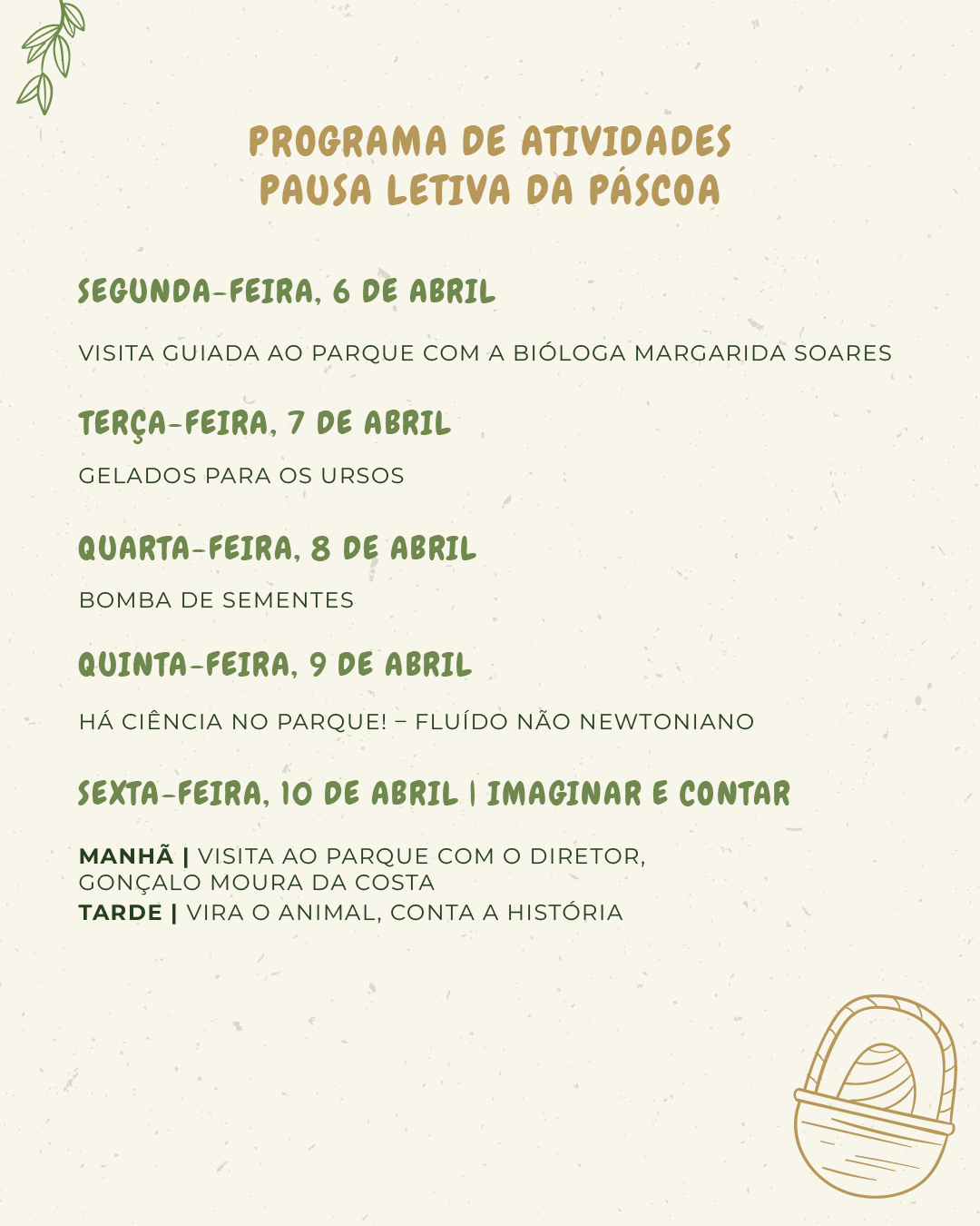 O programa integra temas como criar com a natureza, reciclar e cuidar, conhecer e semear, vida selvagem, ciência no parque e imaginar e contar, com destaque para iniciativas como gelados para os ursos, bombas de sementes, fluído não newtoniano, atividades de família e visitas guiadas especiais.